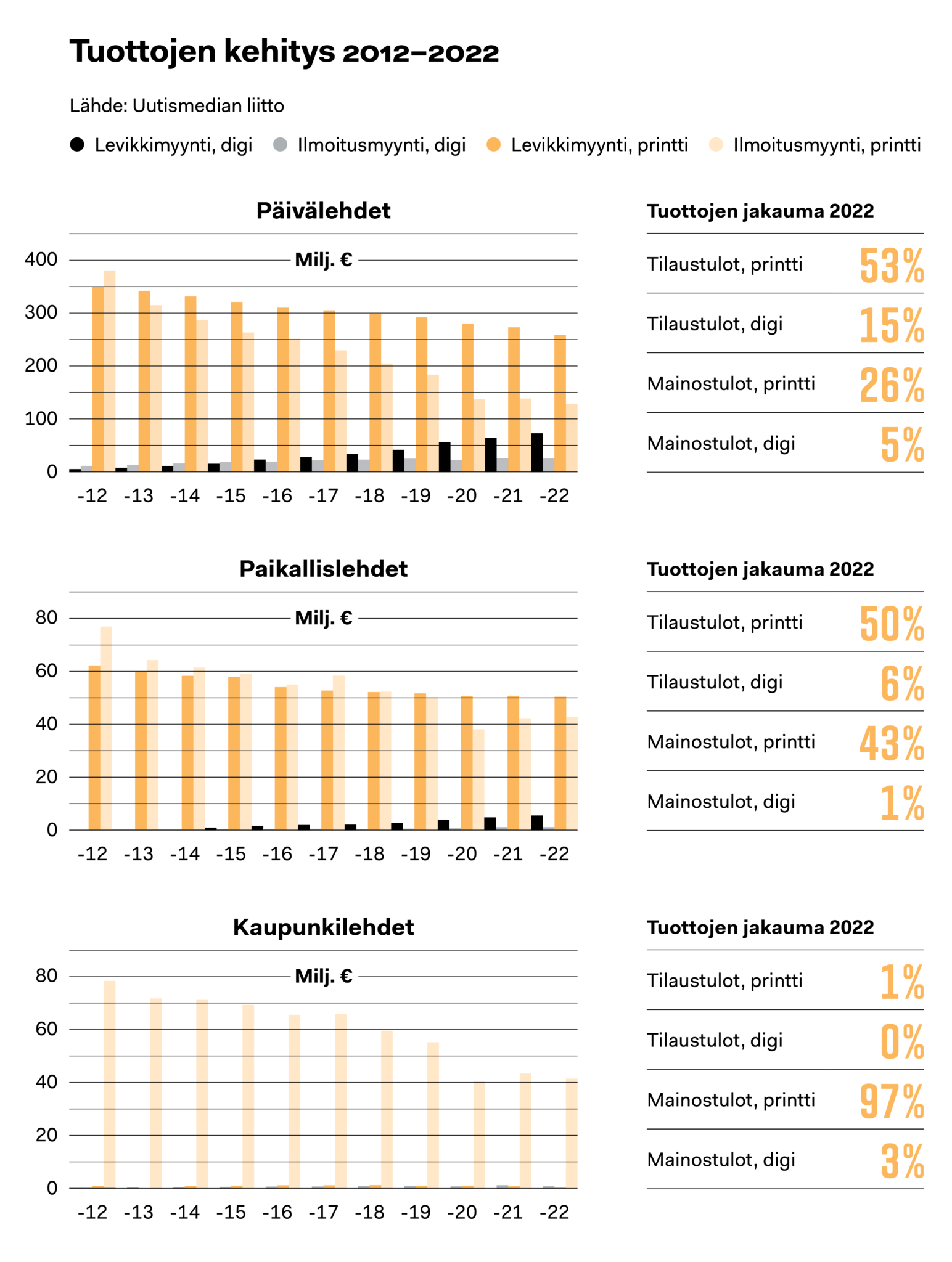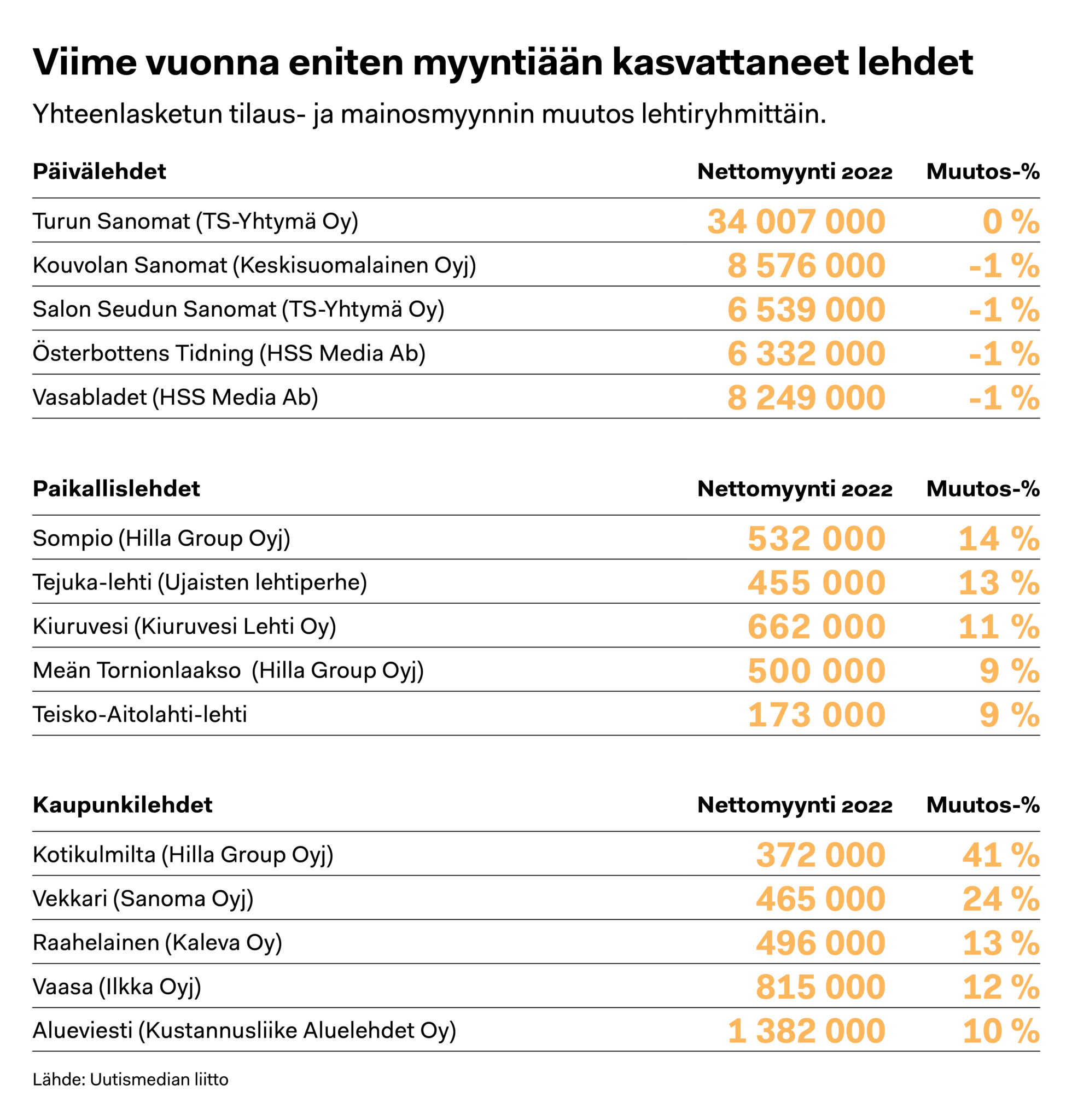 Paikallislehtien myynti pysyi viime vuonna ennallaan: mainonta laski pari prosenttia mutta reilun prosentin kasvaneet tilaustulot tasasivat tilannetta. Mainosrahoitteisten kaupunkilehtien tulot laskivat kaksi prosenttia.