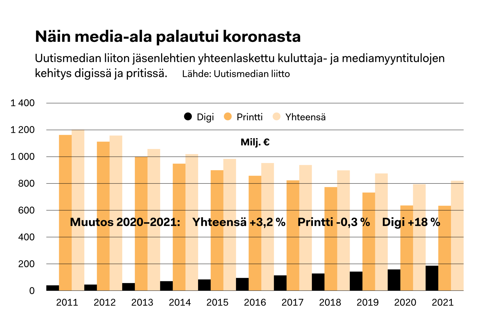 Päivälehtien mediamyynnistä lähti 50 miljoonaa euroa vuonna 2020 ja viime vuonna myynti kasvoi alle viisi miljoonaa euroa.